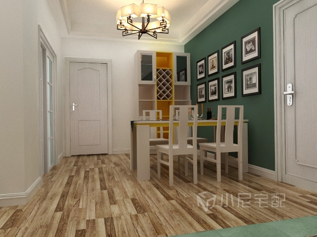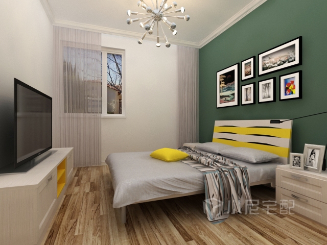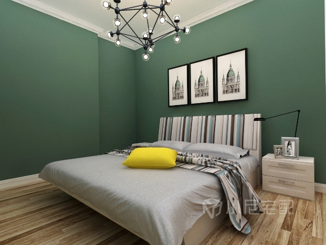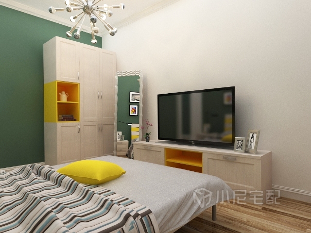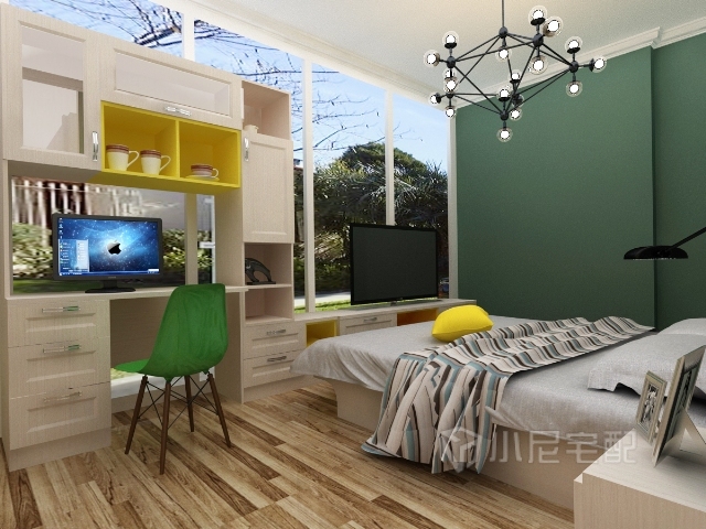 設計風格偏北歐,色彩搭配明快舒適,暗綠色和明黃色的搭配有耳目一新的感覺,同時也提升了空間的層次感