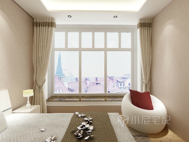 次臥放置一個單人沙發(fā)、白色加紅色顯得更時尚簡約。平凡中蘊含著素雅魅力。