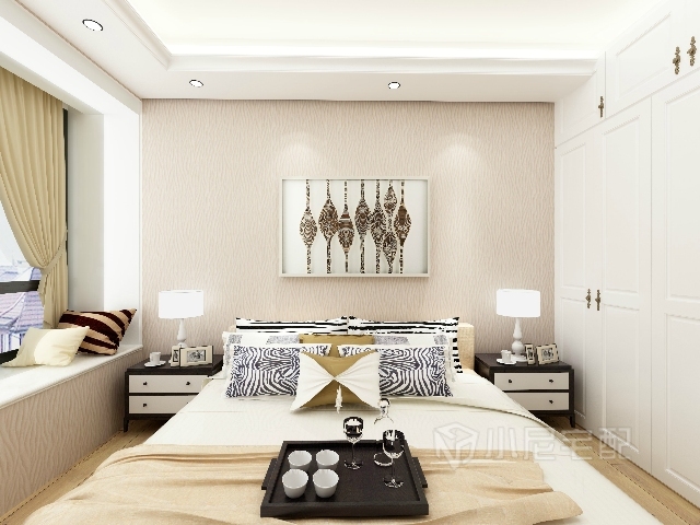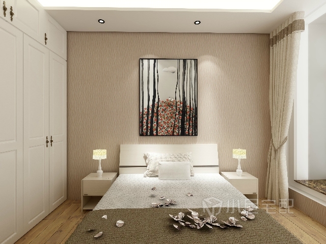 次臥也是以暖色壁紙搭配、床頭又掛現(xiàn)代裝飾畫、時尚又大氣。