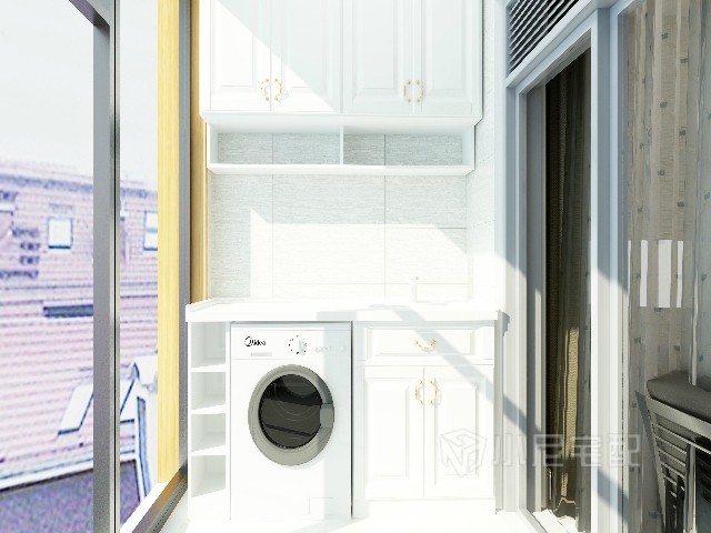 陽臺、放置洗衣機加洗臺池看上去更加美觀,實用性方便、吊柜可以放些洗衣液??瓷先ズ啙嵜烙^。