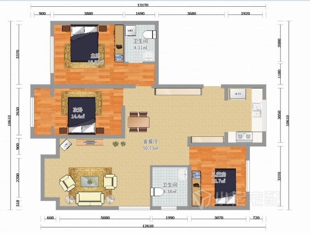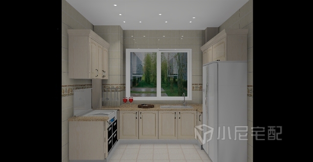 廚房暖色為主,利用集成灶更加節(jié)省空間。