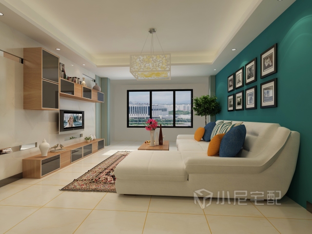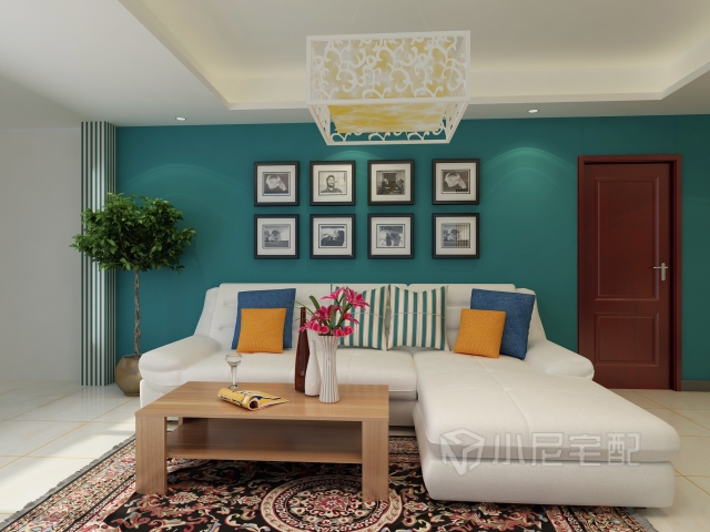 深色的背景,白白的沙發(fā),藍黃的抱枕,顏色交相呼應,整個空間看起來和諧而寧靜