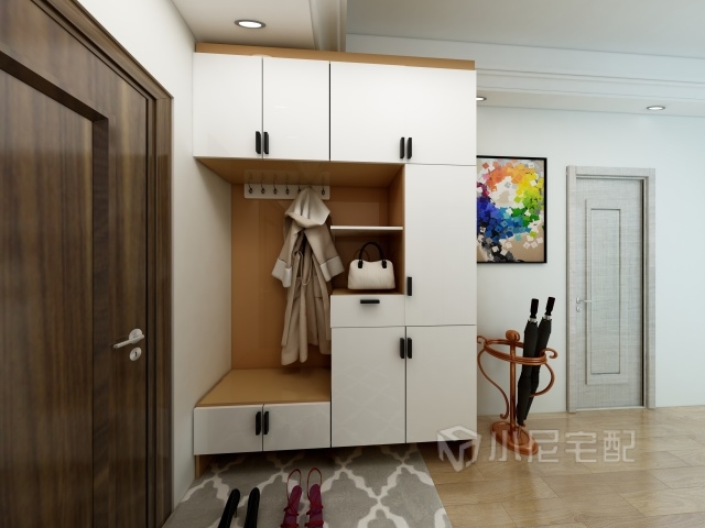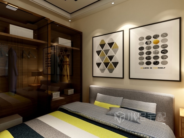 現(xiàn)代風(fēng)格 衣柜透明一目了然。棉布軟包床頭,簡(jiǎn)約現(xiàn)代畫,