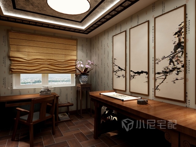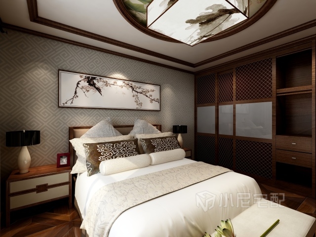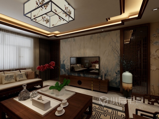 對(duì)稱是中式的特色設(shè)計(jì),電視墻添加對(duì)稱的中式木格柵裝飾,搭配水墨畫,凸顯中式獨(dú)有的特色