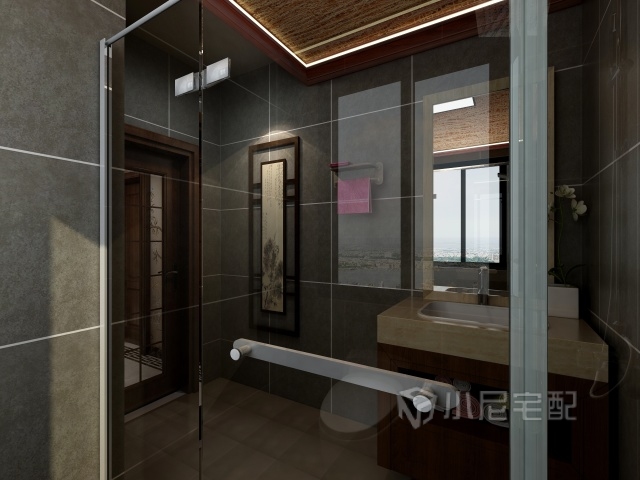 衛(wèi)生間搭建了玻璃浴房起到干濕分離的左右,獨(dú)特的吊頂和掛畫點(diǎn)綴著中式的空間。