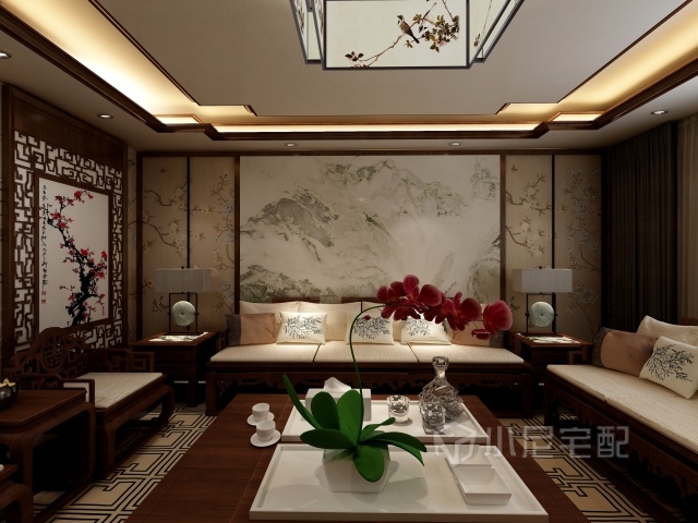 沙發(fā)背景墻使用國(guó)畫裝飾和電視墻相互呼應(yīng),添加掛飾點(diǎn)綴空間