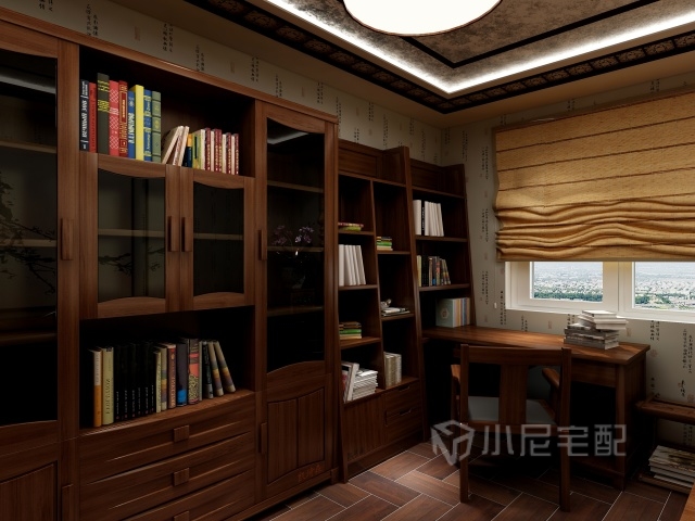 整面墻的書柜,巨大的容納空間,滿足主人日常所有書籍的擺放,書桌提供安靜讀書的地方。