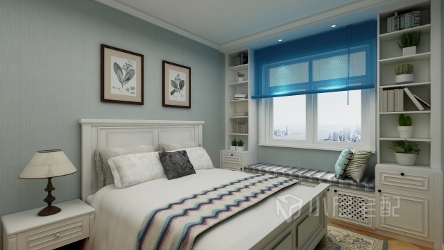 臥室面積比較小那么臥室里就不會有兩個床頭柜了,不妨把床挨著飄窗放,那么飄窗自然而然就成了一個床頭柜了,添上兩個舒適的墊子。又多了一個功能,又變成一個休閑的場所。