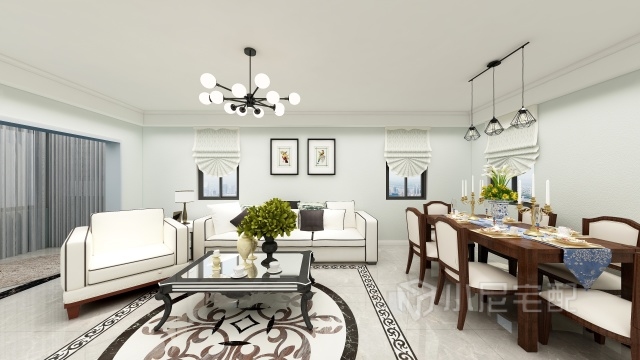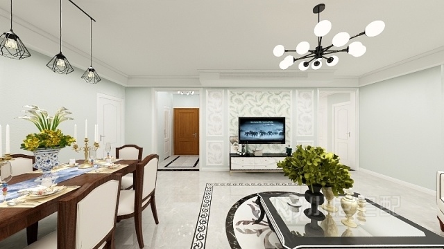 客廳地面中心采用水刀拼花,簡(jiǎn)單中不失特色,客廳餐廳區(qū)域采用不同吊燈區(qū)分,整體簡(jiǎn)潔,滿足使用功能。