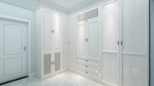 衣帽間采用網(wǎng)格門、百葉門打破傳統(tǒng)的門板,網(wǎng)格門內(nèi)放置鞋襪,更加透氣,長(zhǎng)衣、短衣的各有歸處。