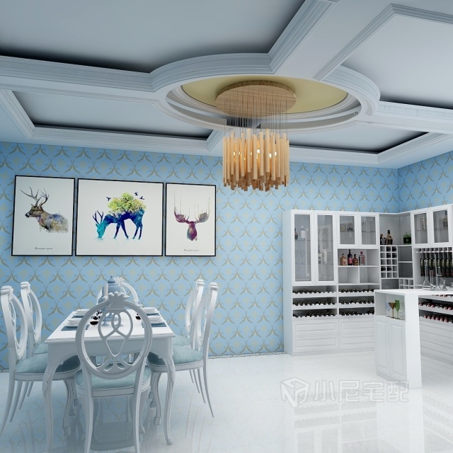 藍(lán)色壁紙搭配白色餐桌酒柜