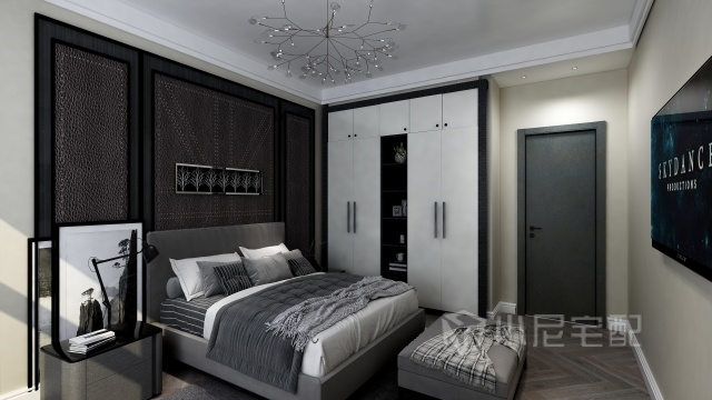 頂面采用規(guī)則的石膏板吊燈和筒燈,床頭背景都運(yùn)用了壁紙等材料。從而營(yíng)造一個(gè)現(xiàn)代化的簡(jiǎn)單,舒適主臥空間??团P的設(shè)計(jì),主要以乳膠漆,壁紙,石膏線條為只要裝飾材料。