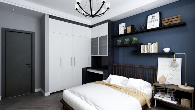 簡(jiǎn)單實(shí)用的衣柜配上字臺(tái)和書架,叫整個(gè)空間功能性增強(qiáng),在加上墻面的顏色奪人眼球