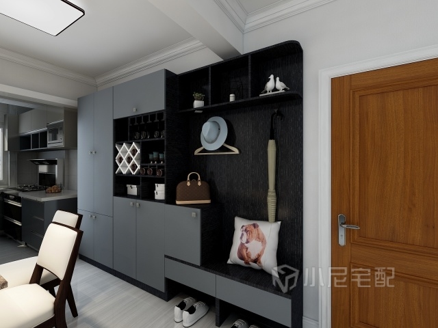 門廳穿鞋登的設(shè)計(jì)滿足了小孩子穿鞋的不方便。同時(shí)又融入了酒 柜的元素。