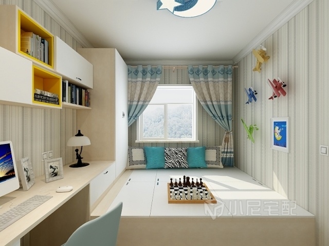 次臥兒童房設(shè)計(jì)了榻榻米的形式。檸檬黃的色彩搭配更復(fù)合孩子天真的個(gè)性