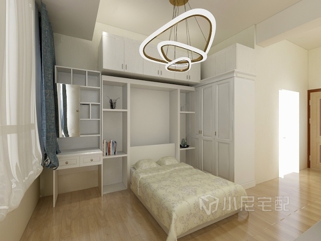 推拉門衣柜設(shè)計,整潔又舒適,進門處白色趟門式衣柜,為小巧的臥室大大節(jié)約了活動空間
