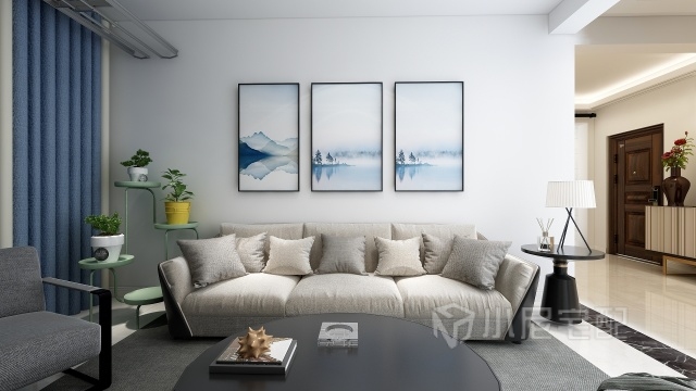 沙發(fā)背景,淡藍(lán)色點(diǎn)綴整個(gè)空間,空間更加靈動(dòng)