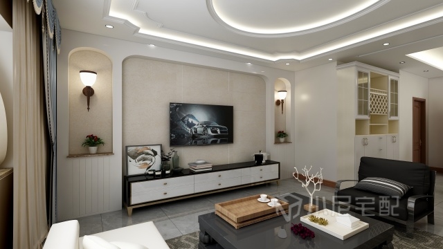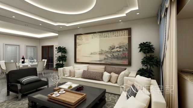 中式的吊頂配上暖色系的壁紙,突出的背景墻給人在冬季有種溫馨的舒適感