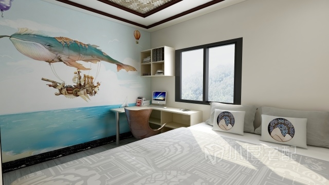 小次臥空間榻榻米的合理利用在加上一個靠窗的書桌給孩子一個好的學習睡眠舒適的環(huán)境
