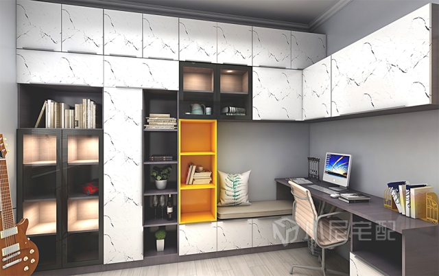 書房燈帶的設計不僅起到裝飾的作用,還烘托了整個空間的浪漫氣氛,使空間形象展示與結構展示更具現代美感。玻璃掩門設計,干凈防塵好儲物,物品一目了然。