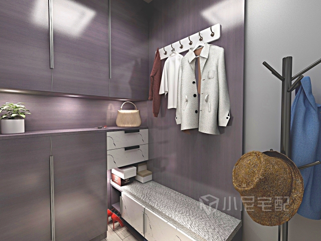 功能區(qū)間明確,中間開放格可以擺放裝飾品和小的物件,下柜貯藏鞋物,桌面放置出門的必須品,矮柜可以在上面休息換鞋,大的衣物就可以掛在長衣區(qū)。整體裝飾型強,充分展現出獨特的設計風格。