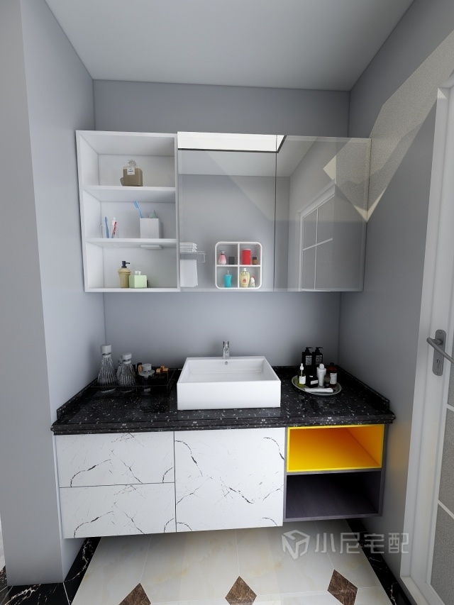 洗手臺儲物的同時又兼具了日常生活品的擺放,柜門鑲嵌鏡面不僅方便了我們日常生活,還有更大的儲物空間,使整個空間視野更廣闊。