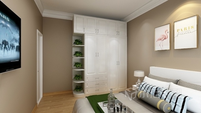 主臥封頂衣柜加上鑲嵌式的衣柜,顯得小空間大利用,色彩搭配也整體美觀大方