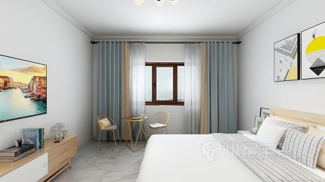 主臥室進門處放個圓角衣柜,進門顯得舒適,配合原木色床套整個屋子一切簡潔為主