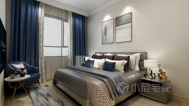 主臥室的設(shè)計(jì)中的簡潔得以特意極致體現(xiàn),功能性滿足同時(shí),在色彩搭配上給了藏藍(lán)色點(diǎn)綴的空間。