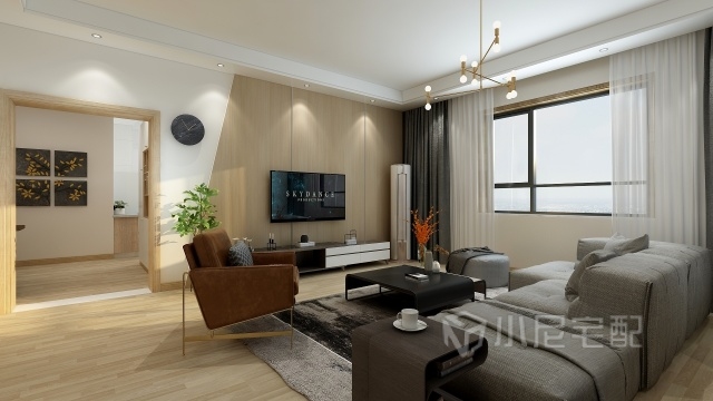 在整個(gè)客廳的區(qū)域中,唯一的硬裝飾就是木紋石棉板上墻的點(diǎn)綴,原木的質(zhì)感紋理帶你體會(huì)自然的溫馨。在暖色調(diào)的空間,原木色的出現(xiàn)可以平和暖色墻面的清爽。