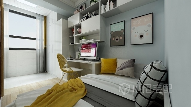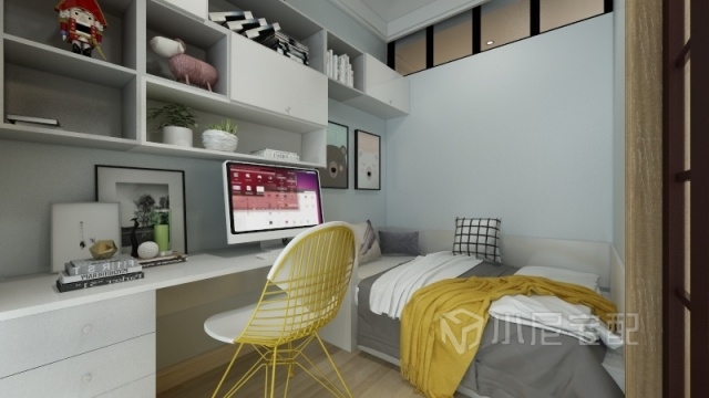 在小孩房的設(shè)計(jì)中以孩子活動(dòng)空間為主的同時(shí)保證了睡眠的需求。淺綠色的墻面和檸檬黃色的搭配給了孩子夢想的空間,也給孩子活潑好動(dòng)的自由空間。