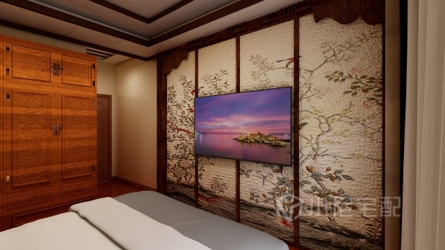 主臥中單獨(dú)做了一個(gè)電視背景墻,避免了因?yàn)閼粜偷脑蛩斐傻膿頂D。
