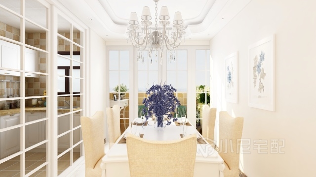 餐廳白色推拉門增加空間采光率,米色餐桌椅,讓人食欲很好