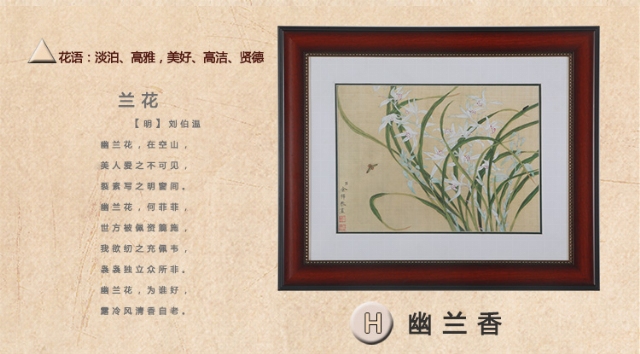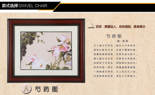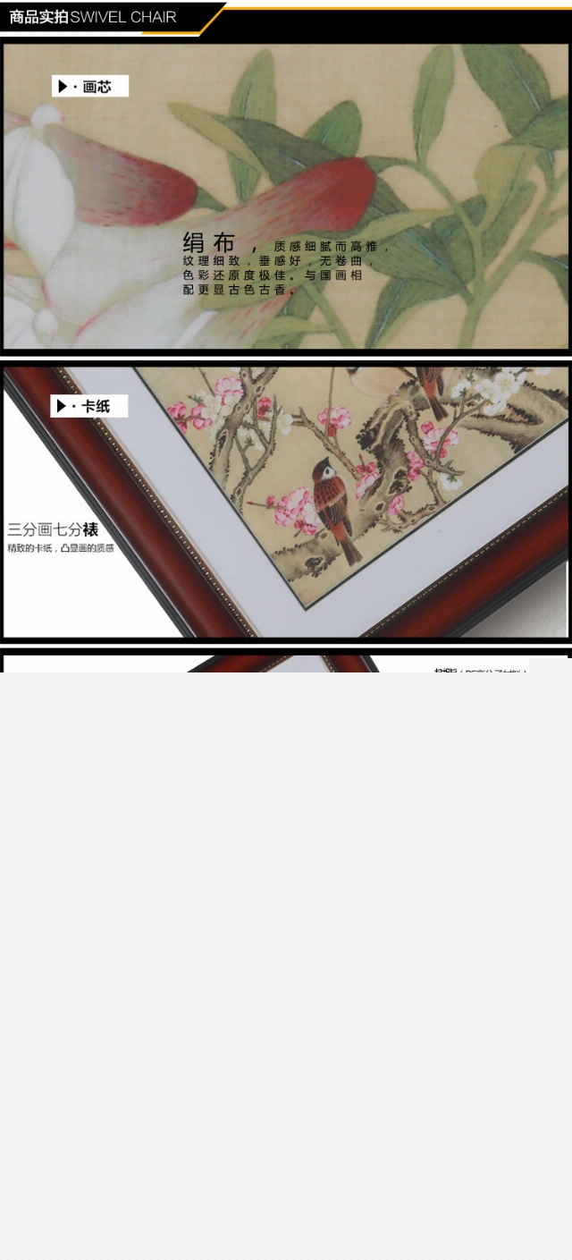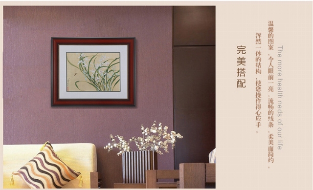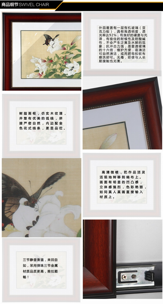 樹脂畫框,仿實(shí)木紋理,并塑有優(yōu)美的弧線,拼接嚴(yán)密自然,內(nèi)邊配金色花式線條,更顯品位。