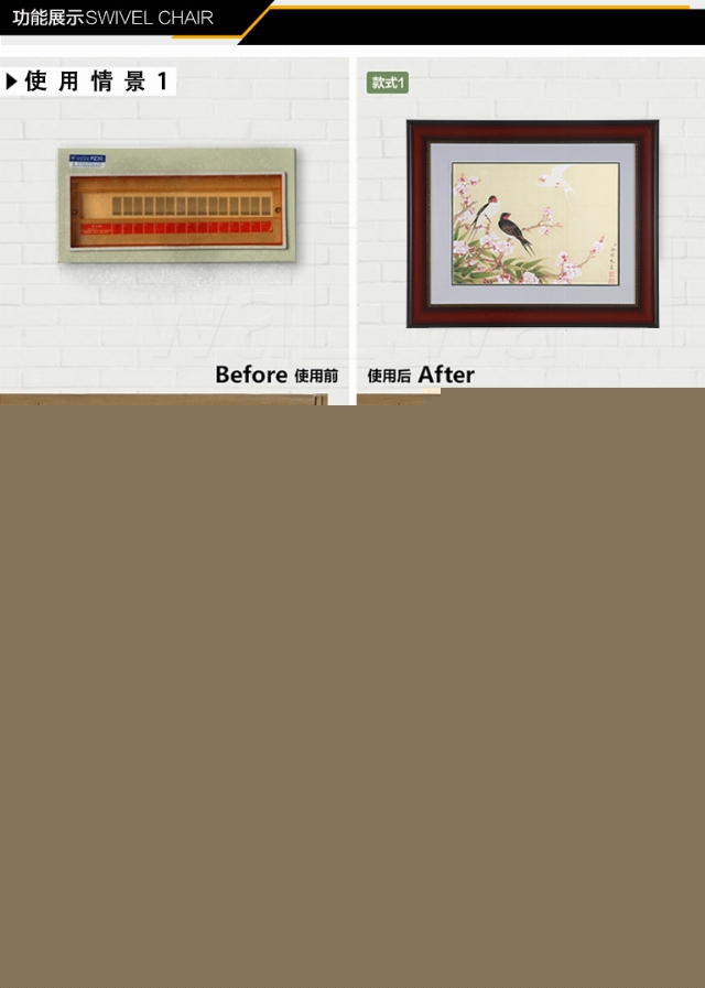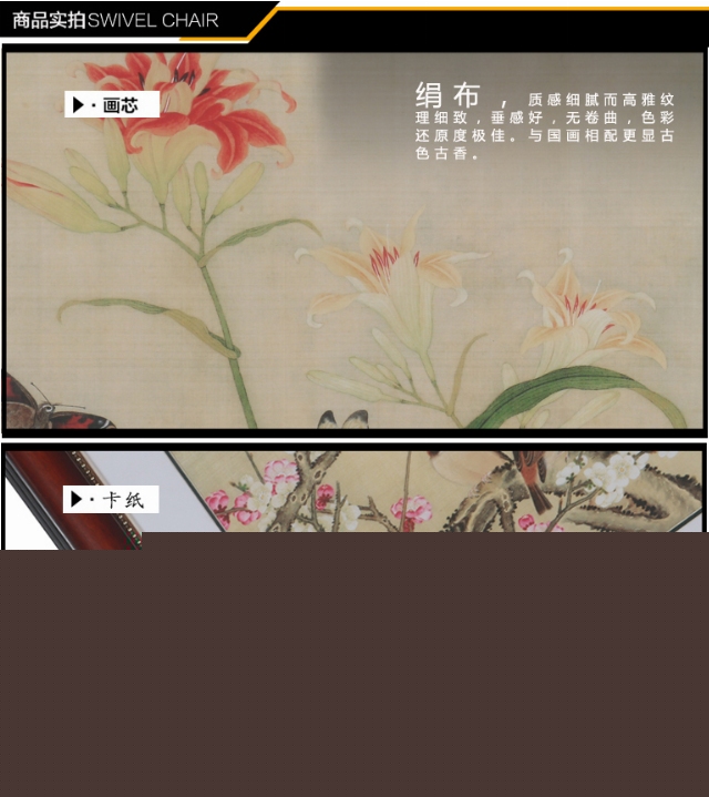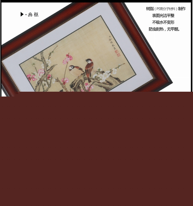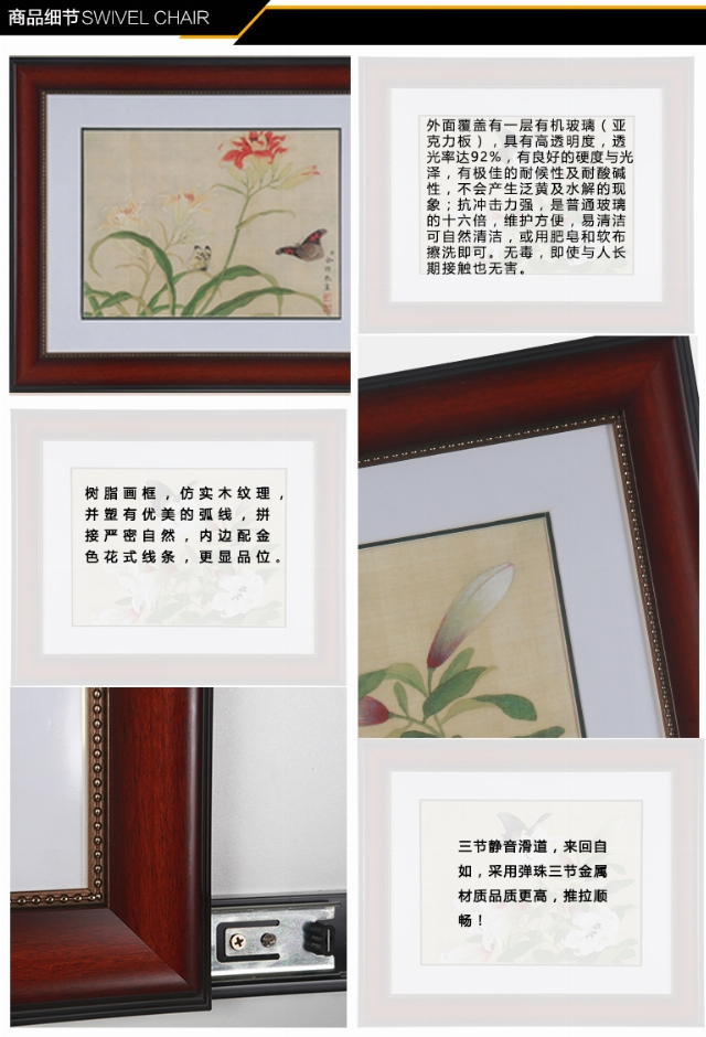 樹(shù)脂畫(huà)框,仿實(shí)木紋理,并塑有優(yōu)美的弧線,拼接嚴(yán)密自然,內(nèi)邊配金色花式線條,更顯品位。