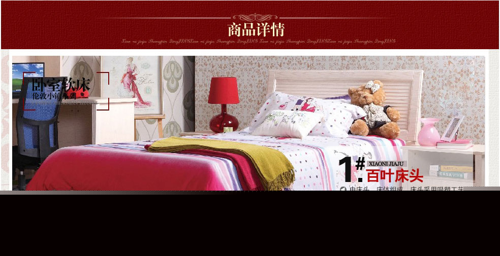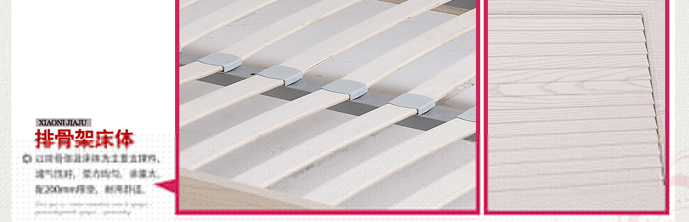 | 規(guī)格 | 床頭:270*128*927mm 床體:2035*1260*323mm 床墊:1200*2000*200mm 排骨架:1200*2000*50mm 衣柜:908*533*2075mm 字臺(tái):1200*1080*1995mm 床頭柜:558*401*448mm |