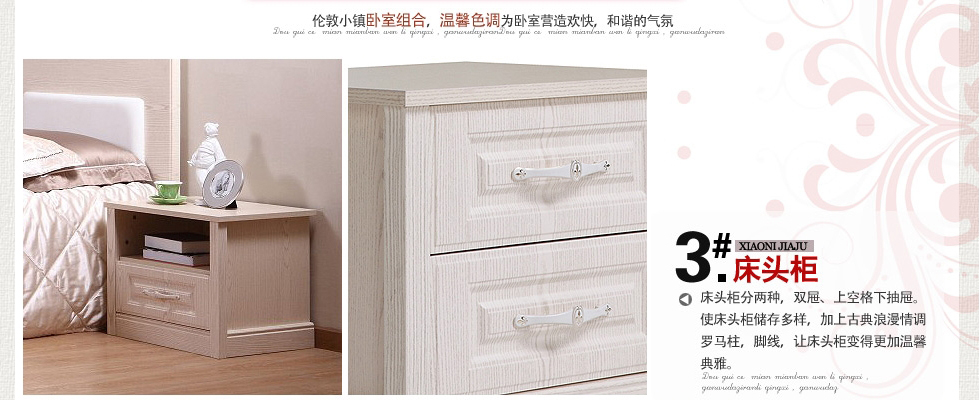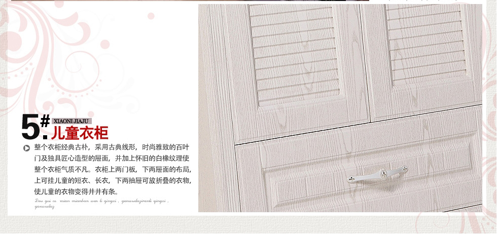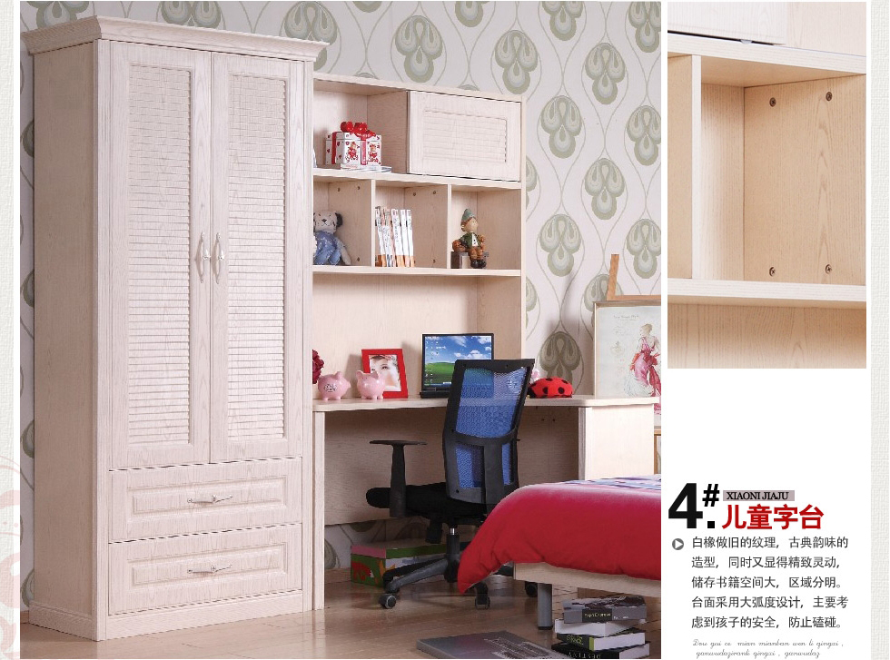 | 細(xì)節(jié)描述 | 床頭采用吸塑工藝,百葉造型,彰顯雅致與活潑;簡(jiǎn)約的床頭柜,小巧精煉,配上羅馬柱等線型,更顯文雅;字臺(tái)以白橡做舊的紋理,古典韻味的線型,同時(shí)又顯得精致靈動(dòng);衣柜經(jīng)典古樸,采用古典線型,時(shí)尚雅致的百葉門及獨(dú)具匠心造型的屜面,并加上懷舊懷舊的白橡紋理使整個(gè)衣柜氣質(zhì)非凡;椅子以弧形的線條靠背、固定扶手,簡(jiǎn)單的造型,卻能給孩子舒心的學(xué)習(xí)體驗(yàn)。 |