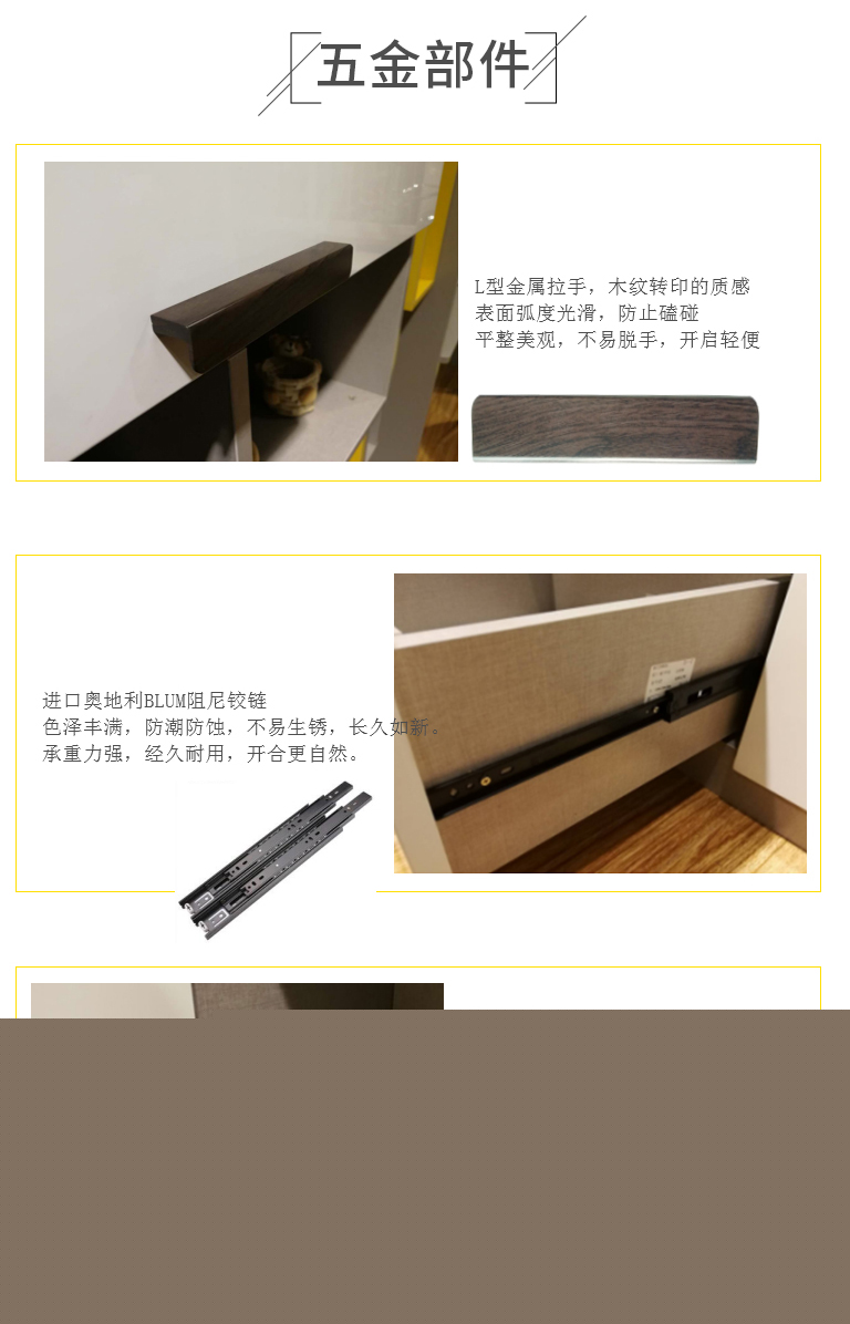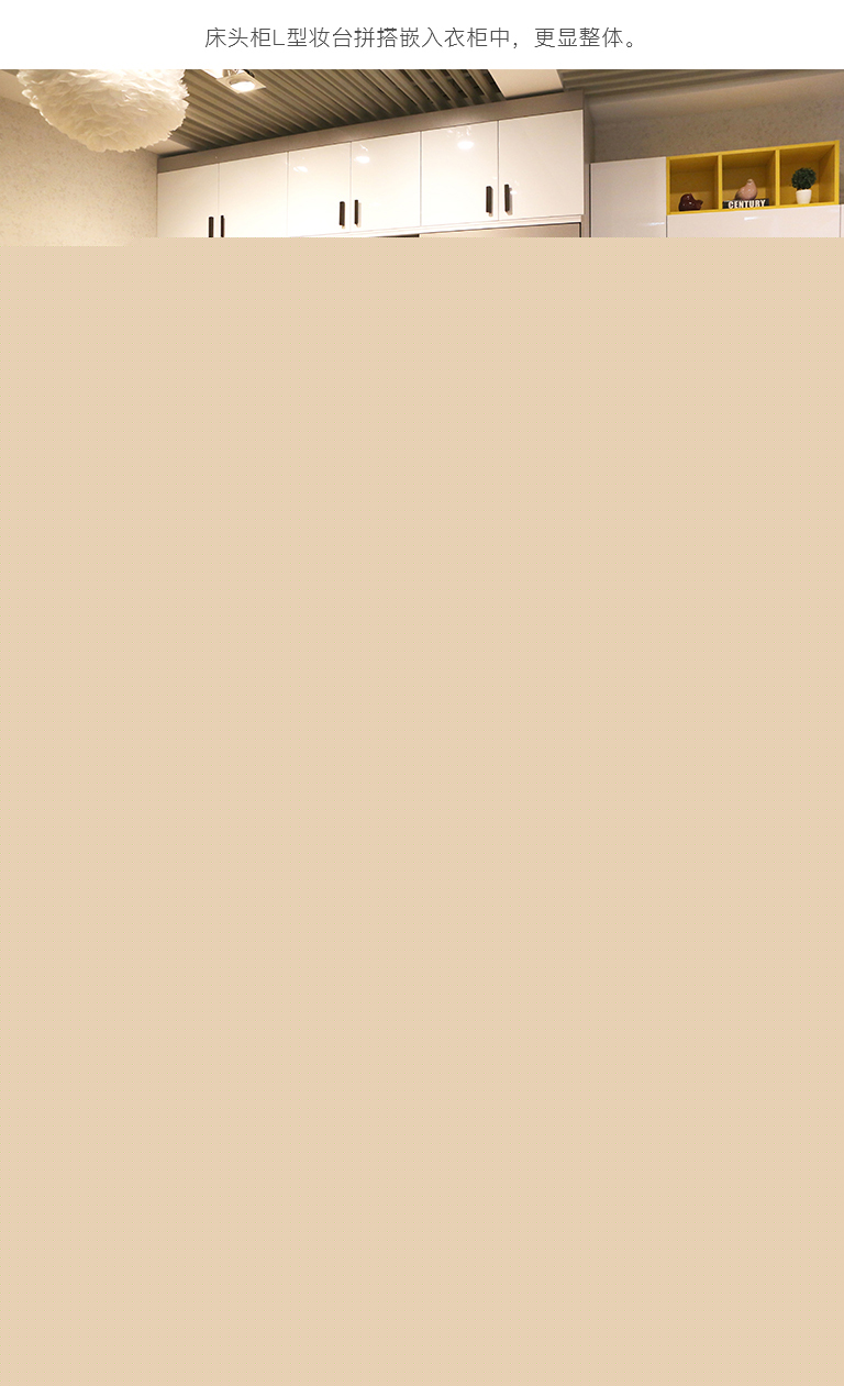 | 細(xì)節(jié)描述 | 定制到頂推拉門衣柜,亮白吸塑和灰布紋的搭配,較之純木色家具更為年輕,都市感更強(qiáng)。床頭柜妝臺(tái)L型拼搭,更顯整體。梳妝臺(tái)化妝品可以分區(qū)放置,生活更精細(xì)化。多工能魔鏡,顯示溫度濕度,方便出門的時(shí)候搭配適當(dāng)?shù)囊挛?,藍(lán)牙播放器功能,讓生活更有品味和樂趣。 |