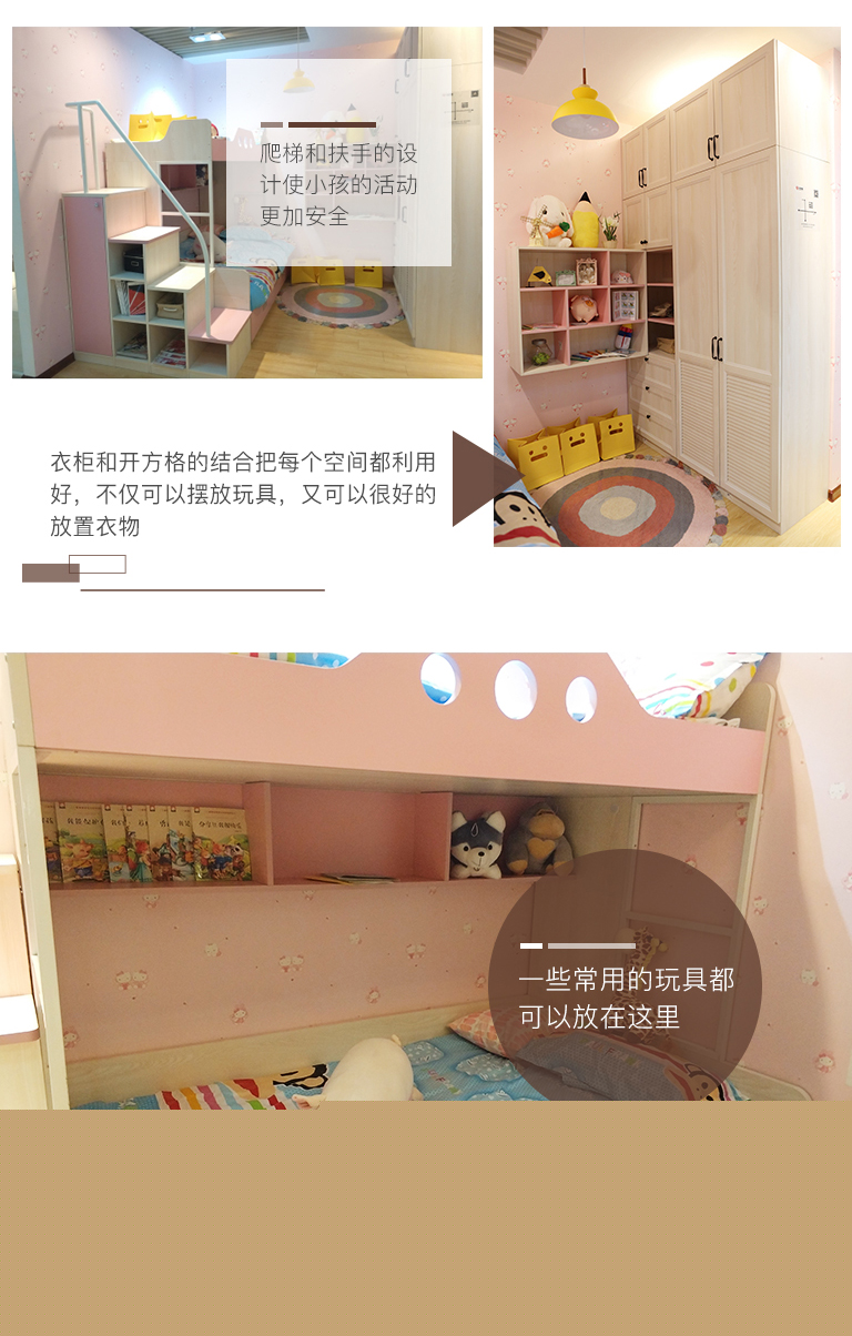 | 細(xì)節(jié)描述 | 雙層兒童床可以容納兩個小朋友,增加了孩子的趣味性和互動性,北美雪松與粉色的搭配,溫馨又舒適。爬梯和扶手的設(shè)計(jì)使小孩的活動更加安全。衣柜和開放格的結(jié)合把每個空間都利用好,不僅可以擺放玩具,又可以很好的放置衣物。 |