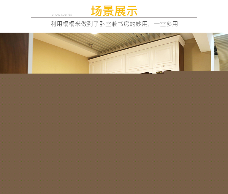 | 細(xì)節(jié)描述 | 這個(gè)房間功能十分強(qiáng)大,利用榻榻米做到了臥室兼書(shū)房的妙用,一室多用。柜體到頂不但美觀而且實(shí)用,兩側(cè)的書(shū)柜完美的區(qū)分休閑區(qū)和學(xué)習(xí)區(qū),書(shū)桌和榻榻米連為一體,小空間大利用。 |