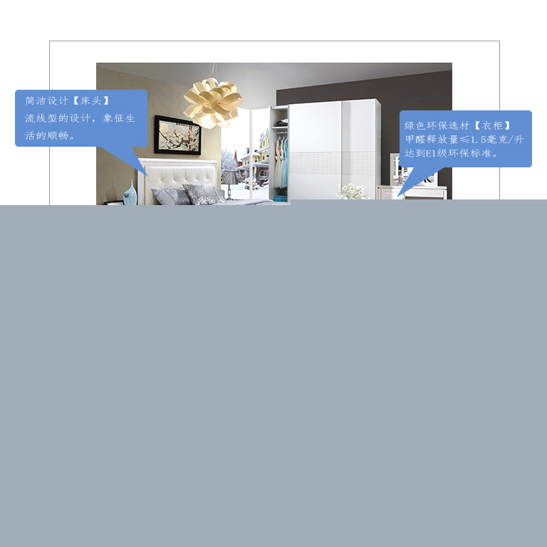 | 規(guī)格 | 外掛門衣柜:2000×605×2250mm、床頭柜:552×400×477mm、軟床:2103×1910×360mm、床墊:1800×2000×260mm、臥房電視柜:1880×450×415mm、妝臺(tái):1100×400×760mm、妝凳:400×300×420mm |