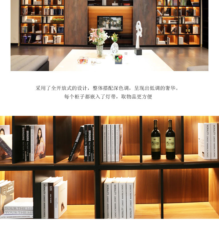 | 細(xì)節(jié)描述 | 設(shè)計(jì)師將電視柜、書柜、展示柜、儲(chǔ)物柜等合為一體,再配上模塊化設(shè)計(jì)手法,大模塊中包含著小模塊,可以不受空間限制,自由組合,隨意中遵循著規(guī)律。 |