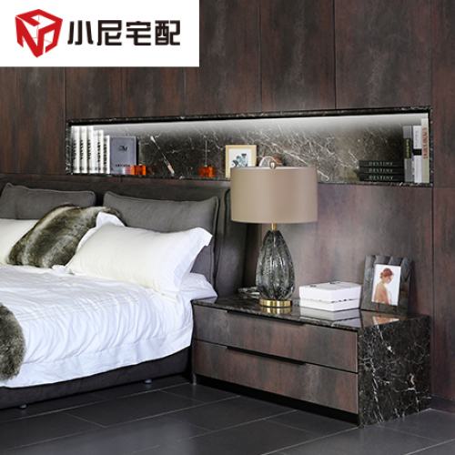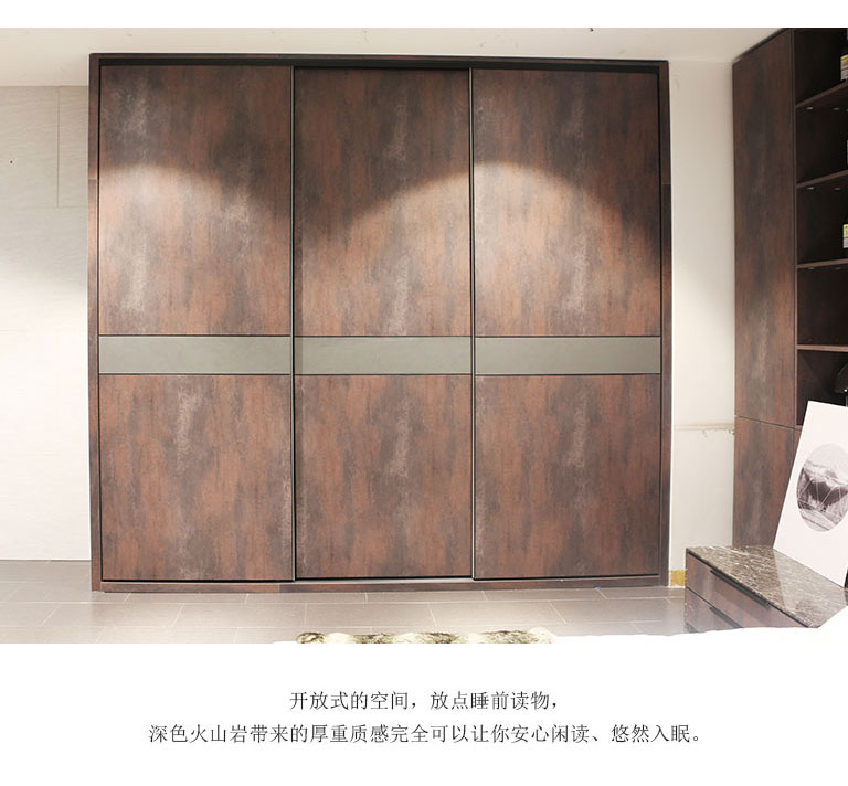 背景墻設(shè)有開放式的空間用來存放睡前讀物,深色火山巖帶來的厚重質(zhì)感完全可以讓你安心閑讀、悠然入眠。